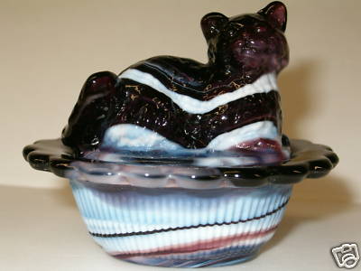 PURPLE & MILK SLAG GLASS CAT KITTEN ON NEST BASKET SALT
