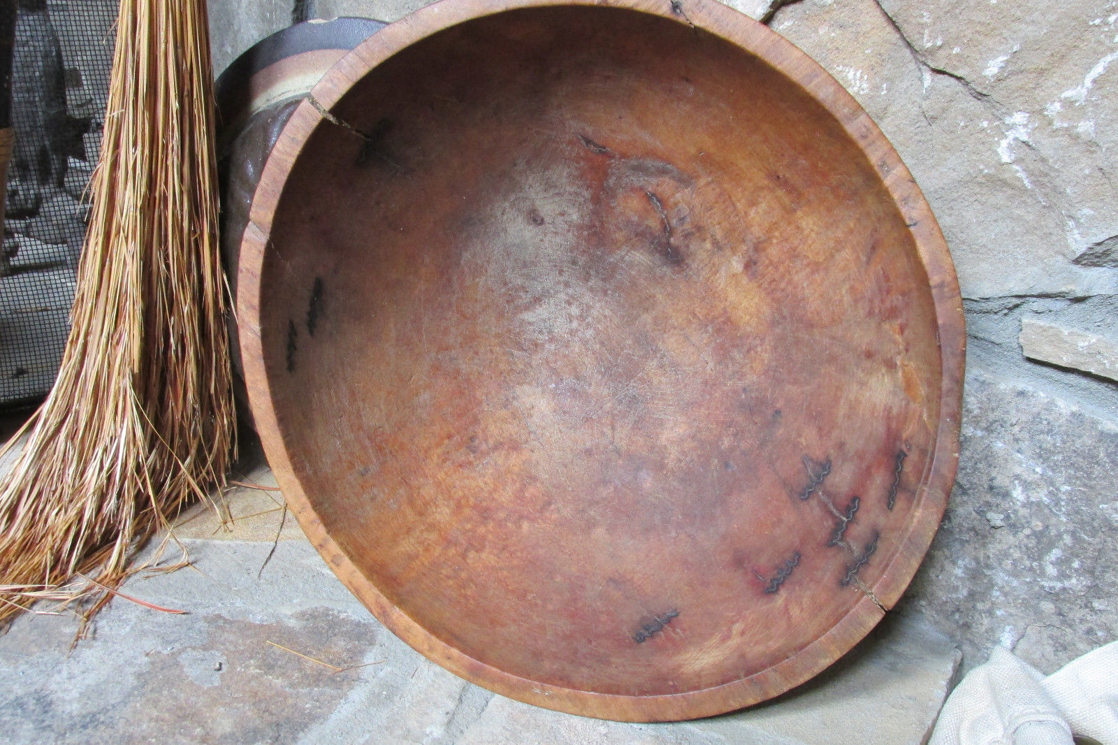 antique primitive farmhouse make do dough bowl metal repairs & out of round AAFA
