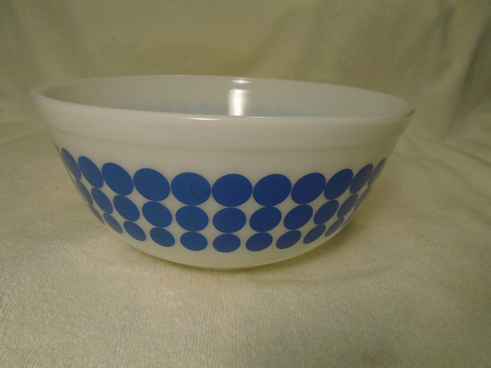 LARGE PYREX 2-1/2 qt BLUE POLKA-DOTS MADE IN USA MILK GLASS MIXING BOWL