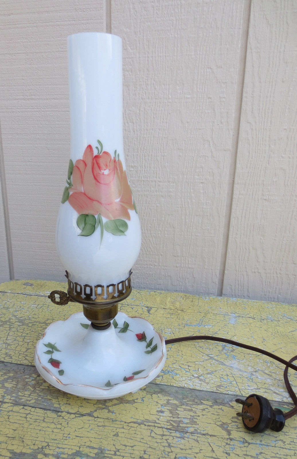 Title (ebay affiliate link): Vintage Milk Glass Lamp Electric Boudoir Dresser Table Handpainted Chimney Base