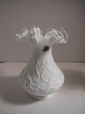 1960''s FENTON WHITE MILK GLASS SILVER CREST SPANISH LACE VASE w/ CRYSTAL EDGE