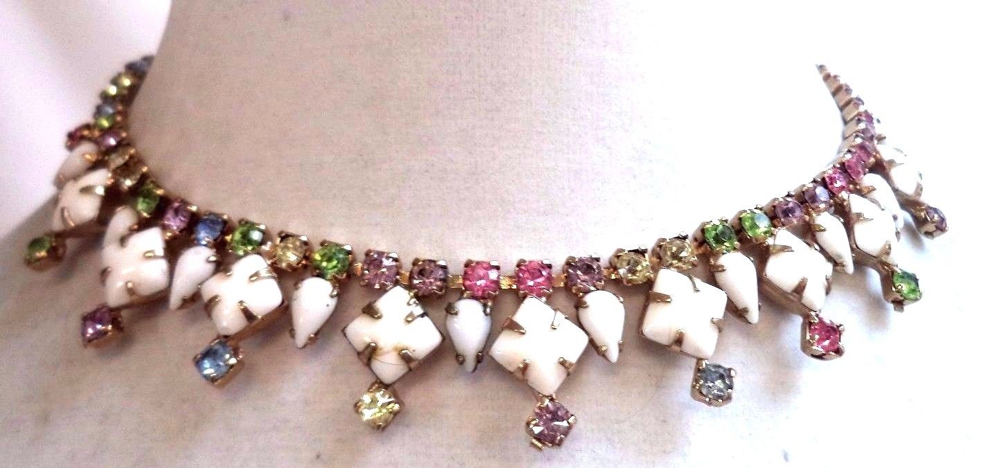 Title (ebay affiliate link): VINTAGE ESTATE HIGH END PASTEL RHINESTONE & MILK GLASS 15" NECKLACE!!! G6352T