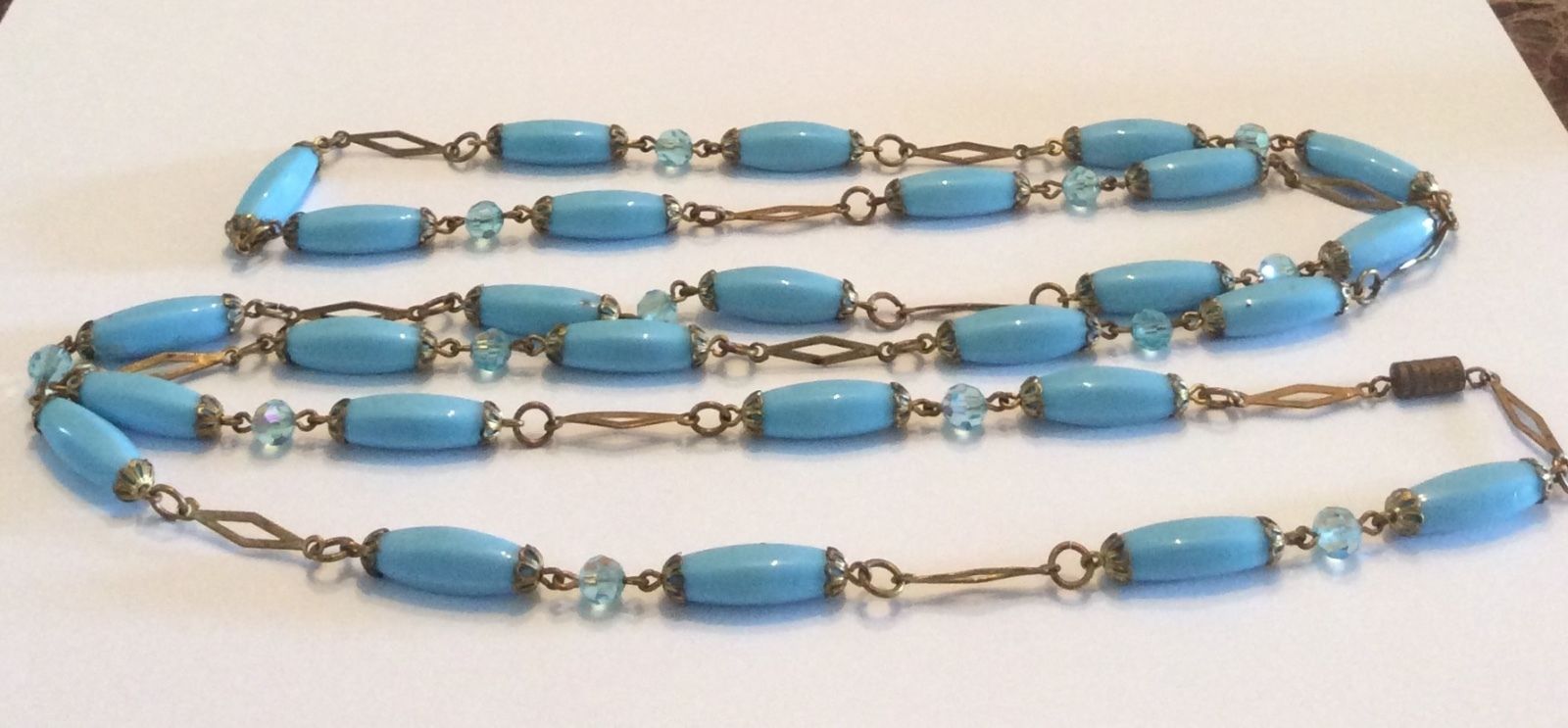 Title (ebay affiliate link): Vintage baby blue milk glass & aurora borealis Crystal bead necklace 52" long