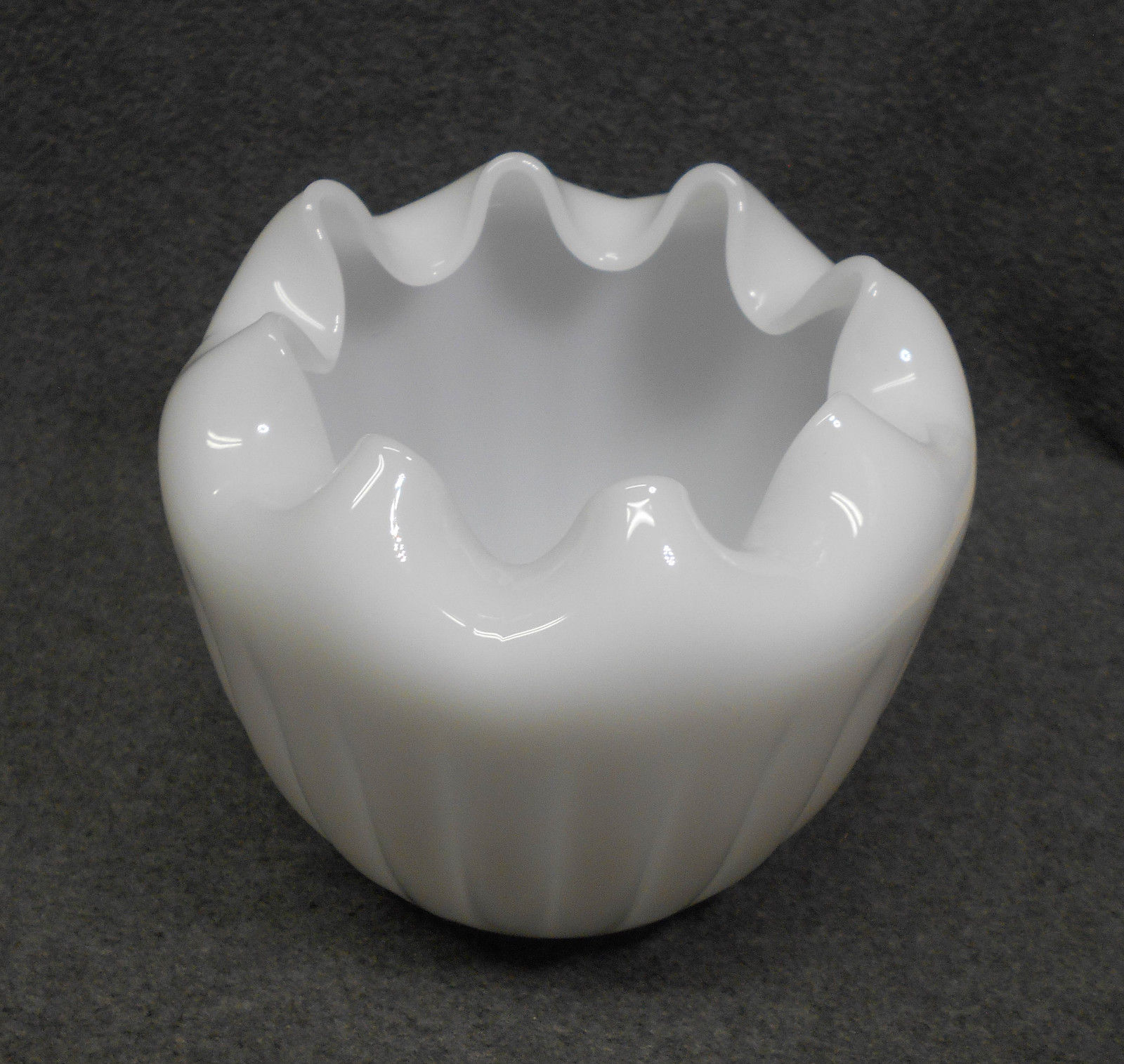Title (ebay affiliate link): White Milk Glass Ribbed Rose Bowl Vase - with Crimped Pinched Rim - Opaque
