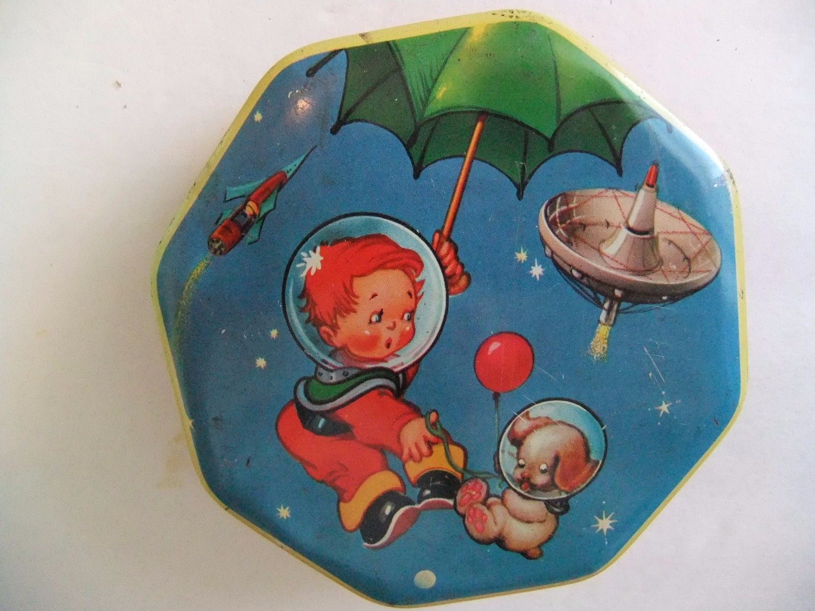 VERY RARE! 1950''s A.S. WILKIN LTD. SPACESHIP Candy Tin
