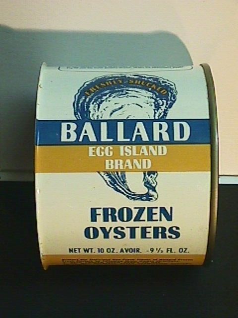 Title (ebay affiliate link): 10 OZ BALLARD EGG ISLAND BRAND OYSTERS TIN OYSTER CAN VA SEAFOOD IRVINGTON VA 84