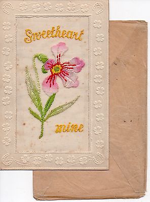 SWEETHEART MINE : WW1 EMBROIDERED GREETINGS SILK POSTCARD + ORIGINAL ENVELOPE