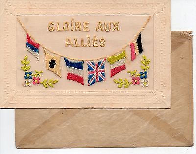 GLOIRE AUX ALLIES: WW1 EMBROIDERED PATRIOTIC SILK POSTCARD + ORIGINAL ENVELOPE