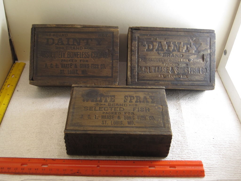 antique primitive wooden advertising boxes,Dainty,White Spray,fish,St.Louis,old
