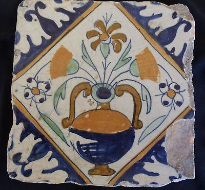 ANTIQUE DUTCH POLYCHROME FLORAL TILE EARLY 1600