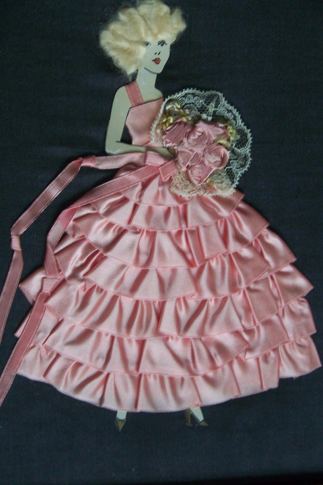 Vintage Framed Paper n Ribbon Doll Silhouette Picture Pink Dress