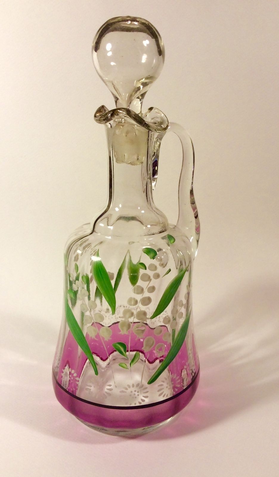 Title (ebay affiliate link): Antique Bohemian Czech Glass Decanter Lily of the Valley H/P Enamel + Stopper