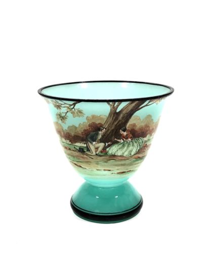 Fine Antique Hand Decorated Enameled Turquoise Art Glass Bowl