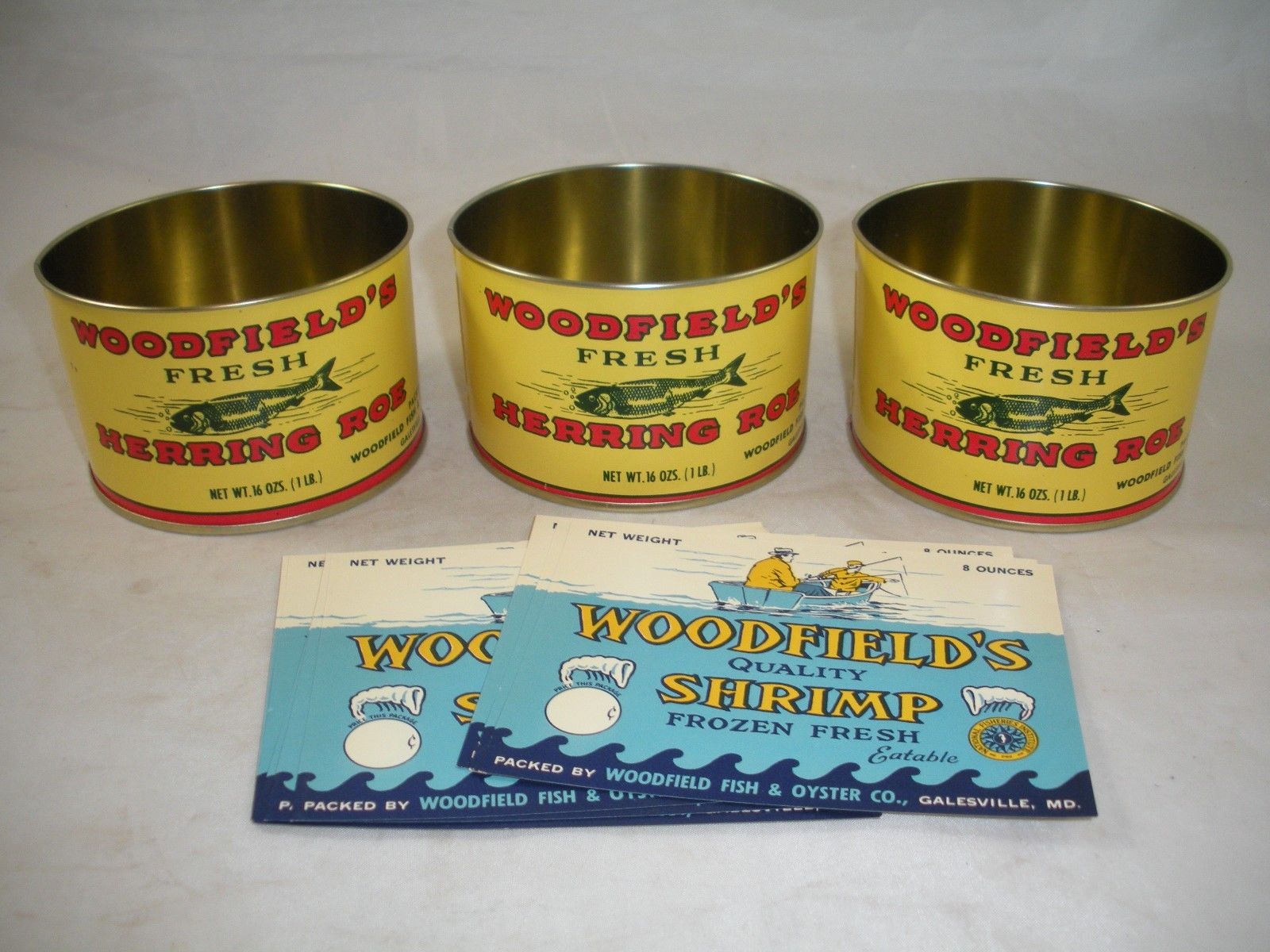 Title (ebay affiliate link): Woodfield Fish & Oyster Galesville MD 3 Herring Roe Tin Can, 12 Shrimp Label NOS