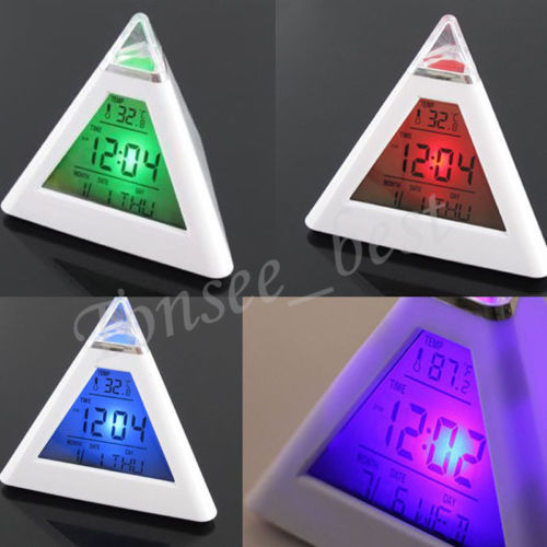 Title (ebay affiliate link): Fashion Pyramid Temperature 7 Colors LED Change Backlight LED Alarm Clock 1