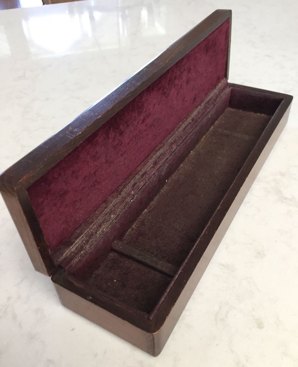 Title (ebay affiliate link): Antique Vintage LONG WOODEN VELVETEEN LINED JEWELRY or TRINKET BOX !!