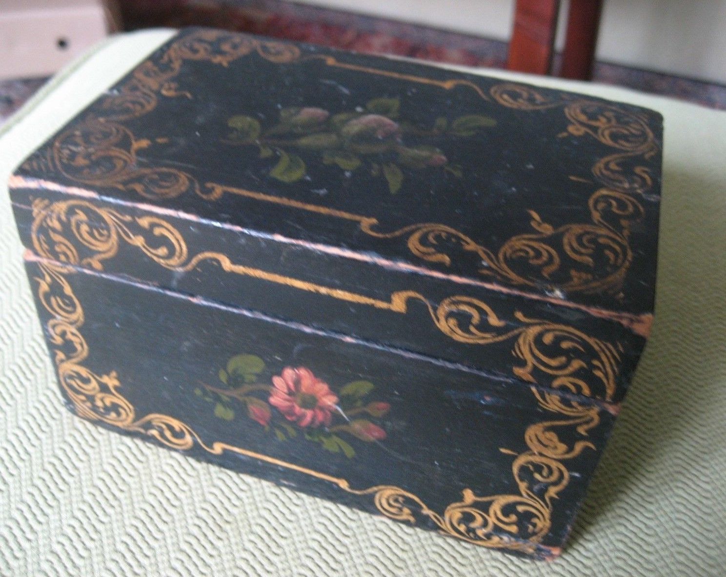 Title (ebay affiliate link): ANTIQUE STENCILED SMALL BOX, FLOWERS, SCROLLING,COIL HINGES,GREAT PATINA