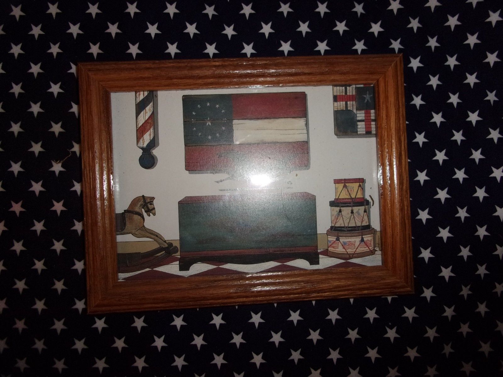 new 5 by 7 inch americana folk primitive framed pic rocking horse barber shop po