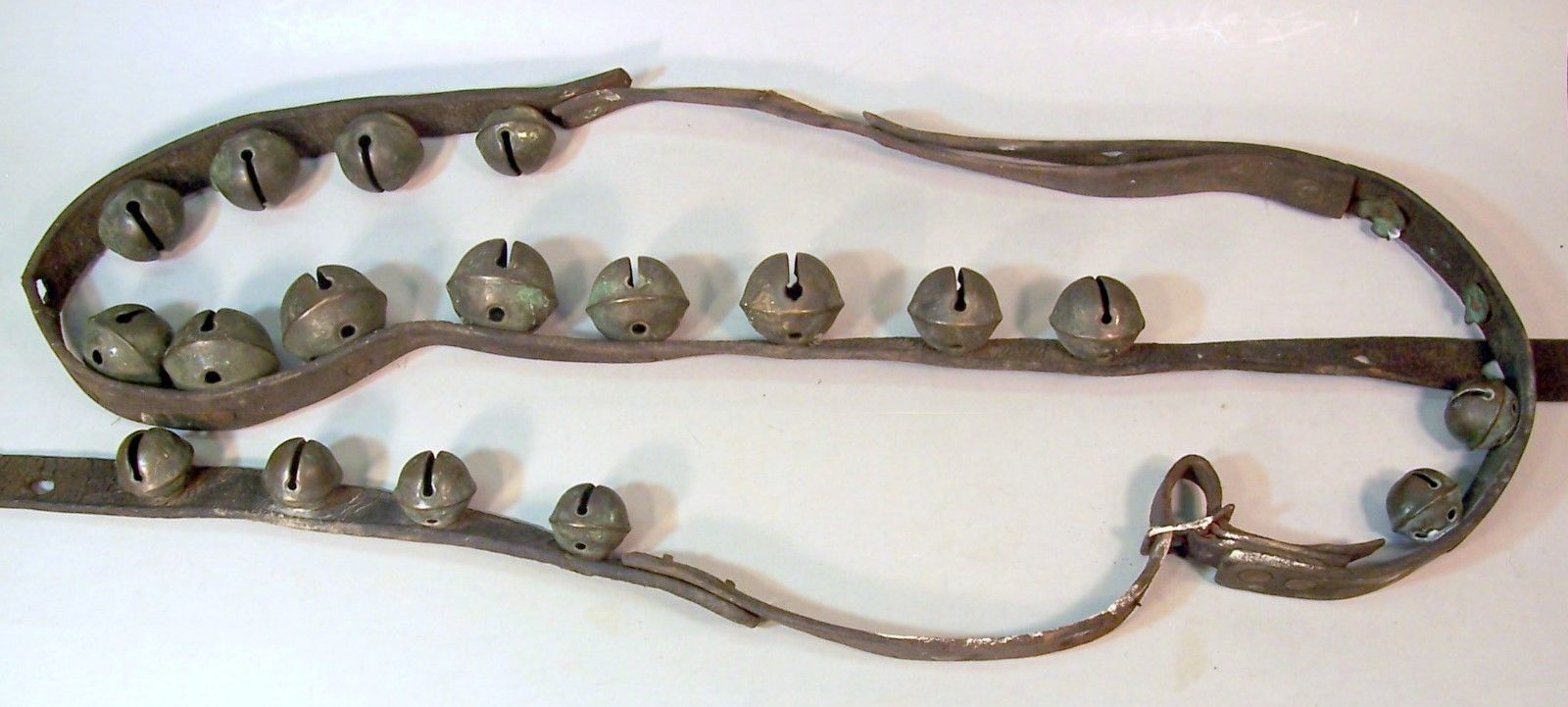 Title (ebay affiliate link): 18 Antique Brass Sleigh Bells on Original Leather Harness