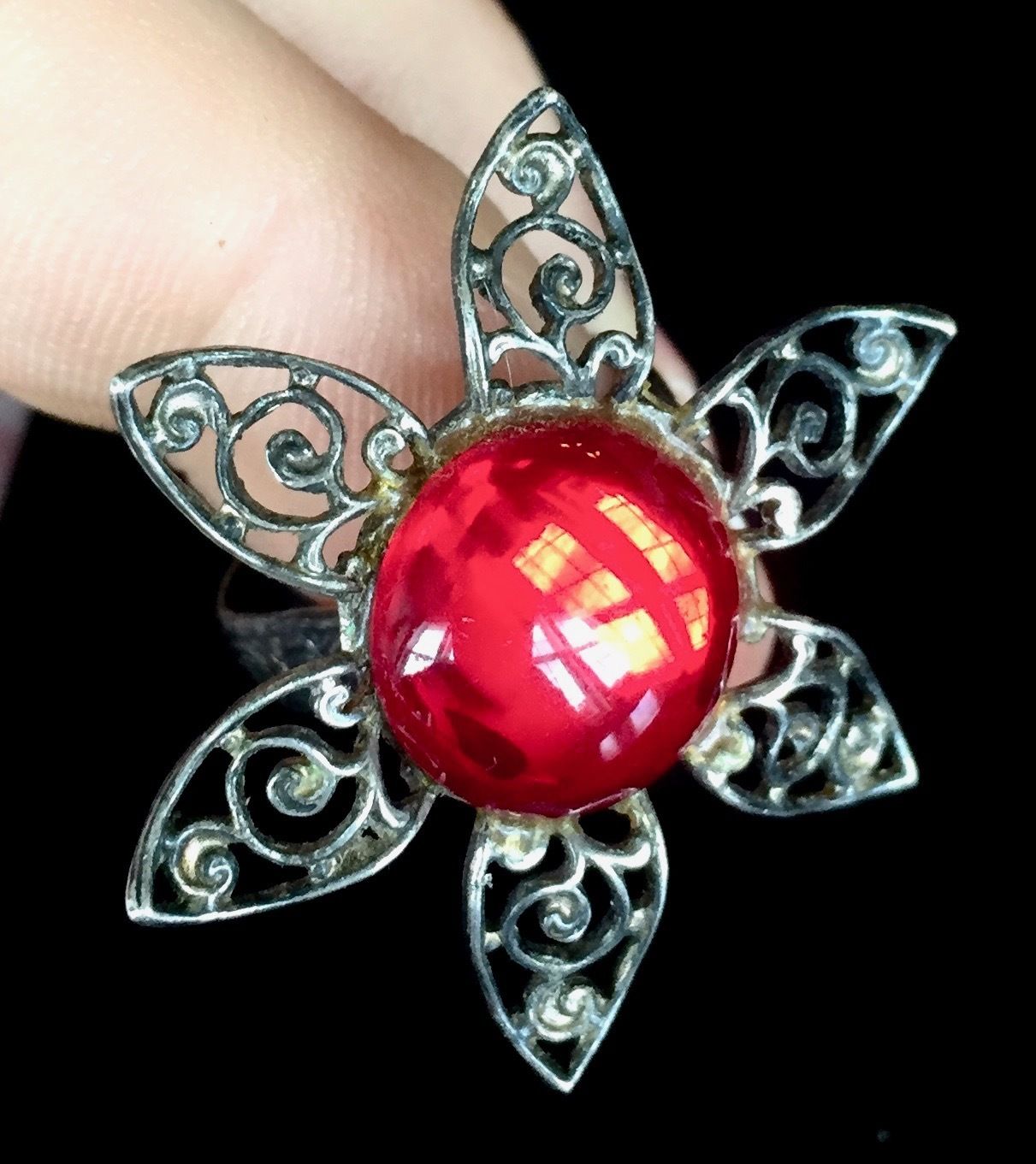 Title (ebay affiliate link): Antique Victorian Sterling Silver Flower Ring Adjustable Size Red Accent Old!