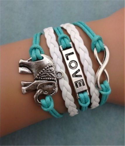 Title (ebay affiliate link): Infinity elephant LOVE Antique Silver Leather Charm Bracelet