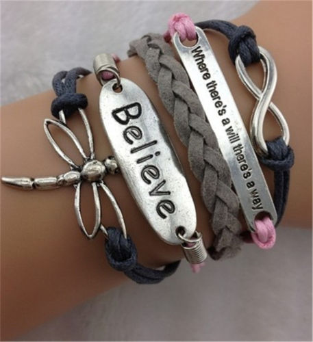 Title (ebay affiliate link): Infinity believe Dragonfly Antique Silver Leather Charm Bracelet