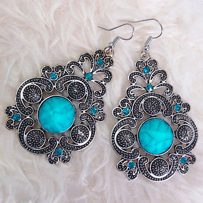 Title (ebay affiliate link): Vintage Womens Bohemian Antique Flower Blue Rheinstone Gem Dangle Drop Earrings
