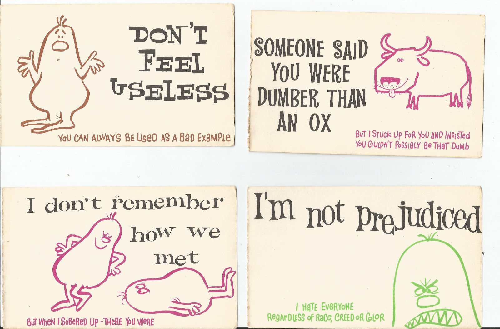 Title (ebay affiliate link): Set of 4 vintage comic joke postcards,"Cool Cards", 1964 Gem Publishing