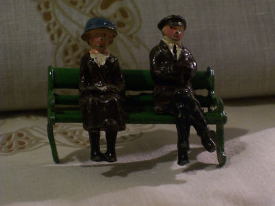 ANTIQUE CAST IRON TOYS PEOPLE SITTING ON BENCH ENGLAND