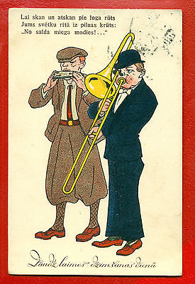 LATVIA LETTLAND MEN PLAY ON Trumpet AND Harmonica.POEM VINTAGE POSTCARD USED 512