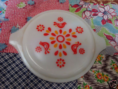 VINTAGE MILK GLASS PYREX LID RED/ORANGE BIRDS FLOWERS