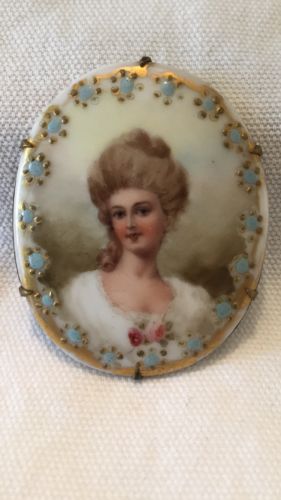 Antique Vintage Victorian Hand Painted Porcelain 18th Century Lady Large Brooch