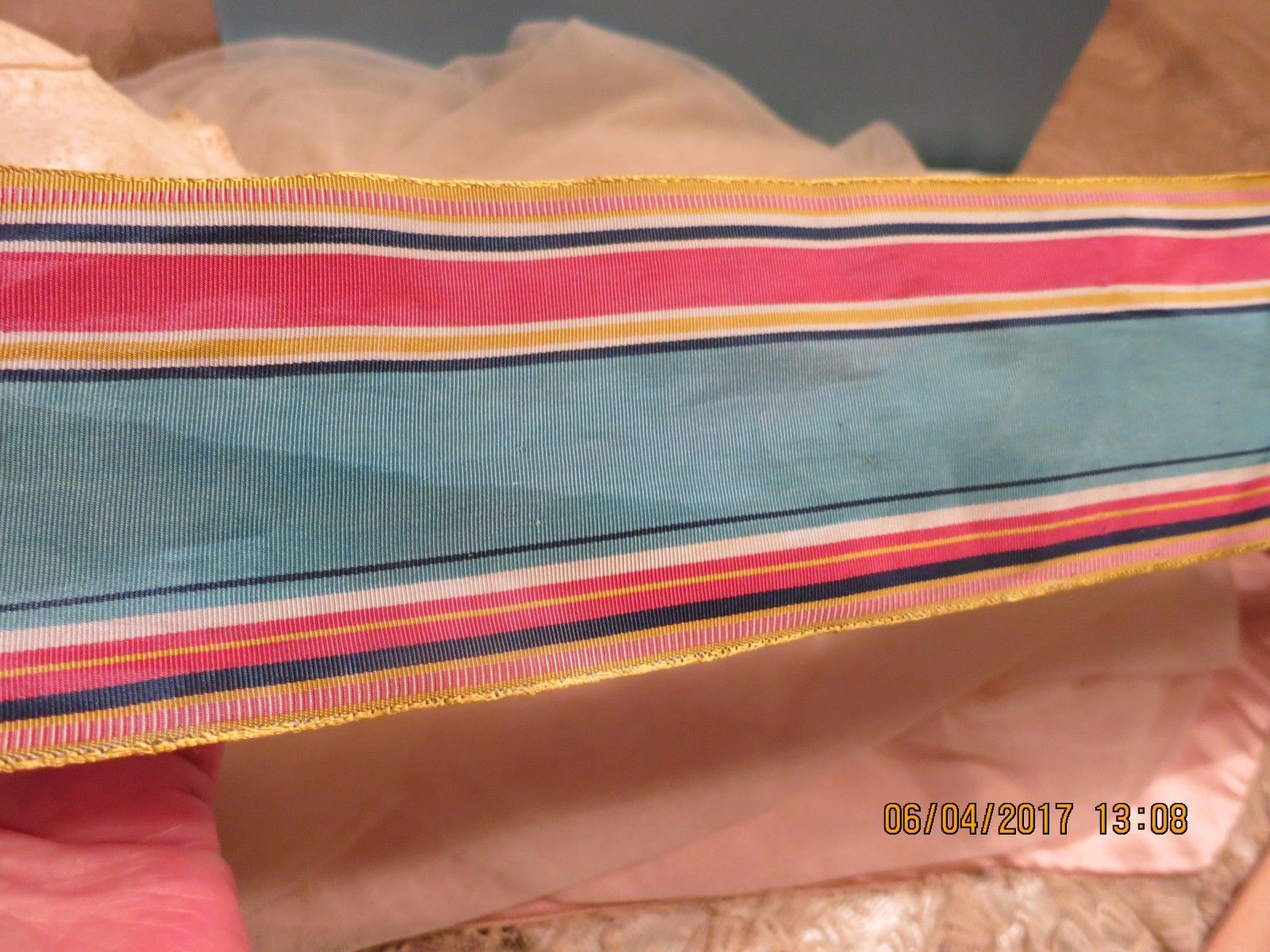 Title (ebay affiliate link): VINTAGE 1950''S 3" TEAL BLUE STRIPE CORAL GOLD BLACK RAYON TAFFETA DOLL HAT