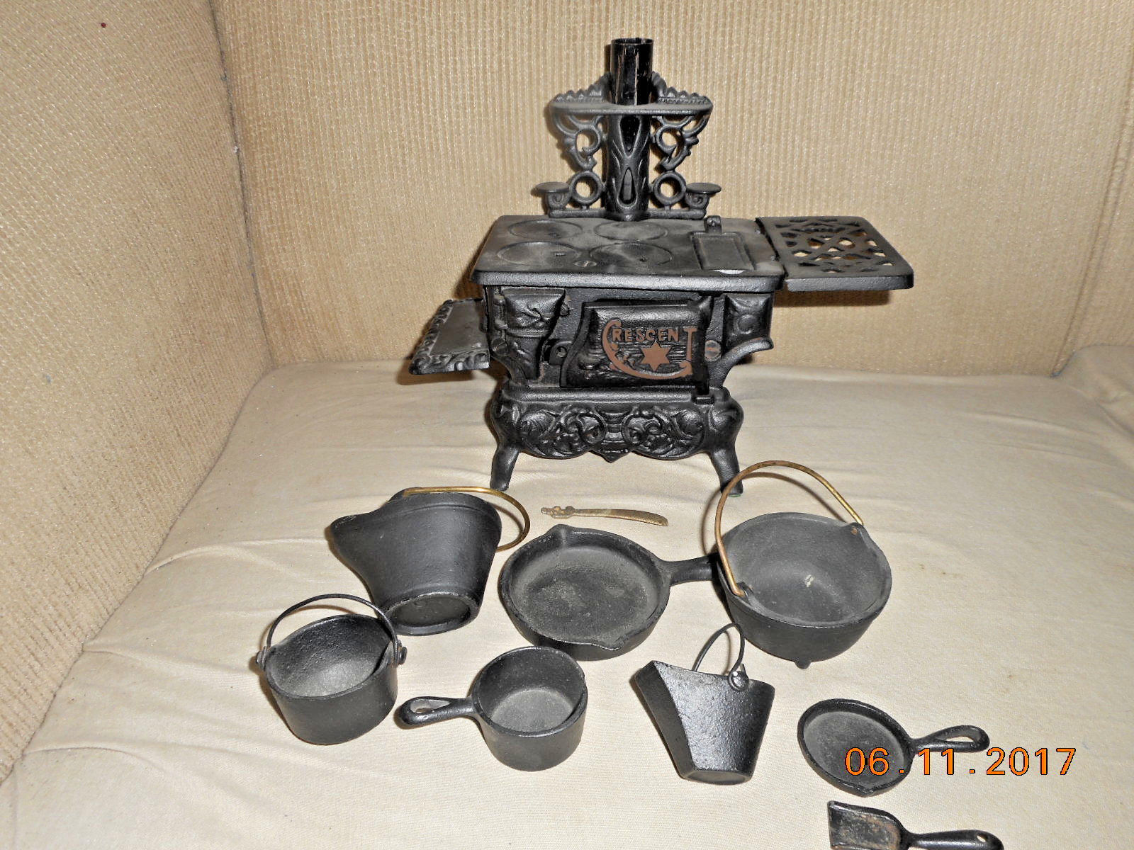 ANTIQUE SALESMAN SAMPLE CRESCENT CAST IRON STOVE COMPLETE IRON TOY POTS PANS