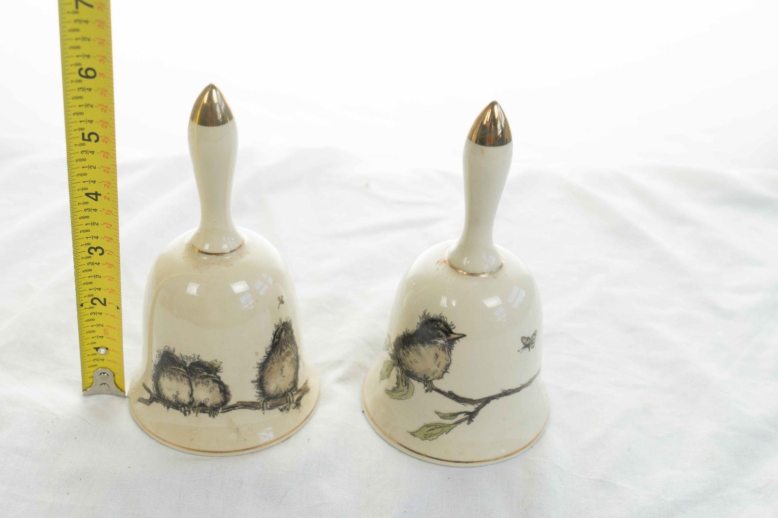Title (ebay affiliate link): ENESCO 1977 MARY MUGG PORCELAIN BELL SET OF TWO W BABY BIRDS TRIMMED IN SILVER