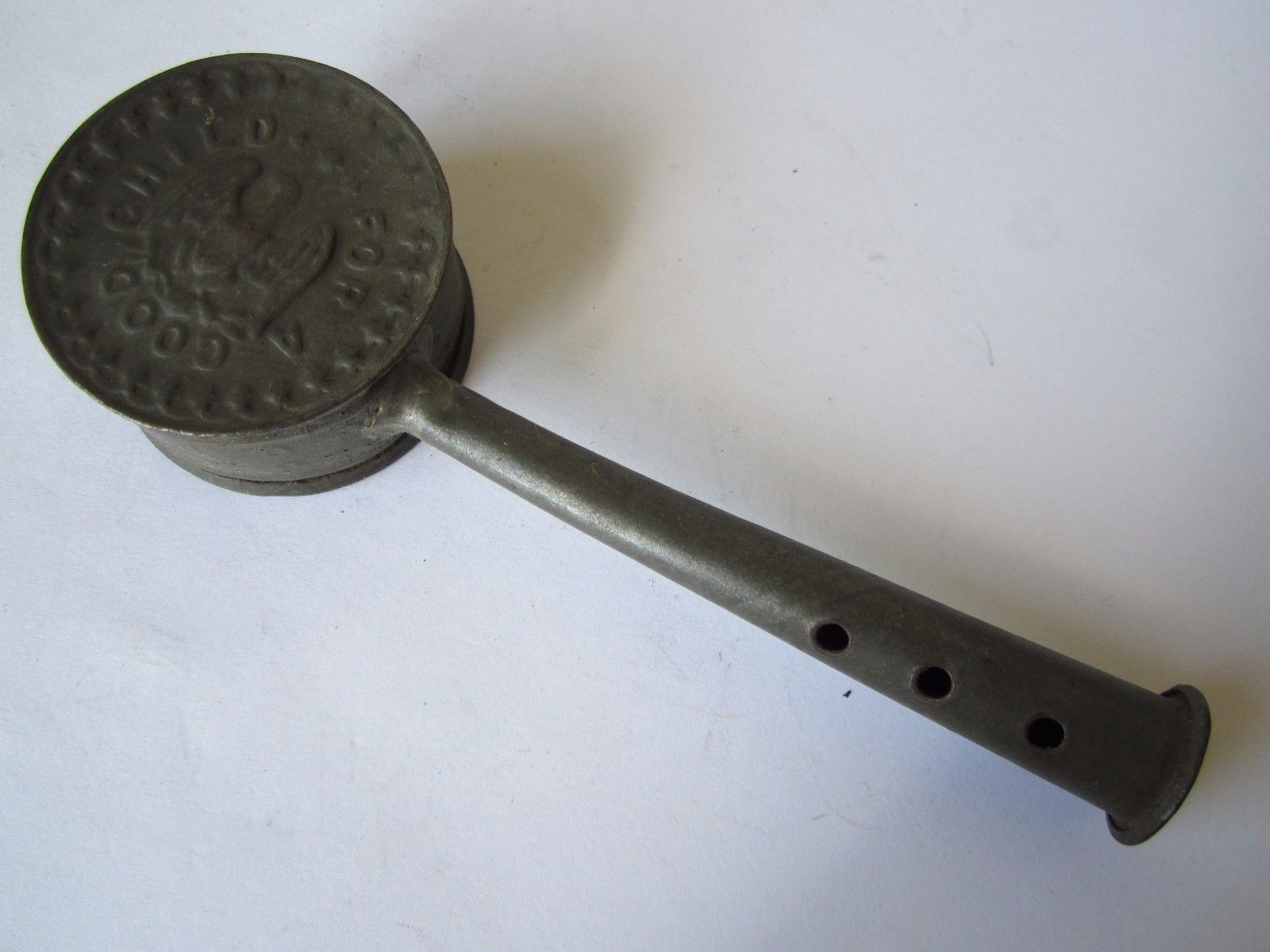 Title (ebay affiliate link): ANTIQUE TIN METAL BABY RATTLE WITH WHISTLE ALPHABET EMBOSSED EARLY EAGLE FORM NR