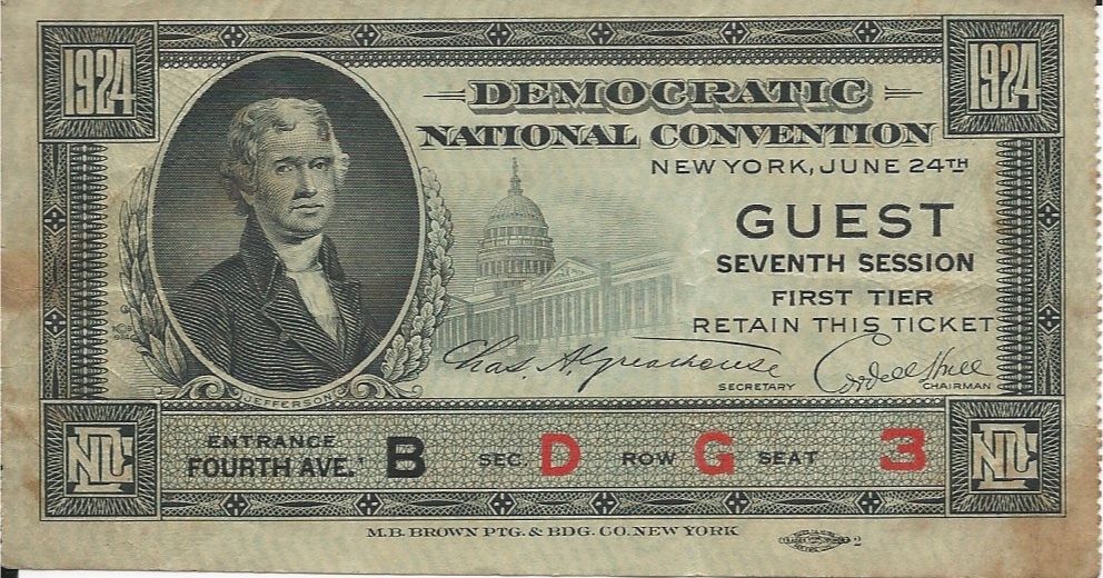 Title (ebay affiliate link): 1924 *RARE DEMOCRATIC NATIONAL CONVENTION GUEST TICKET SEVENTH SESSION NEW YORK.
