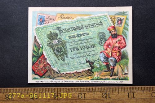 Antique Victorian Trade Card Denison, Jeweler Westerly, R.I. Russian Currency