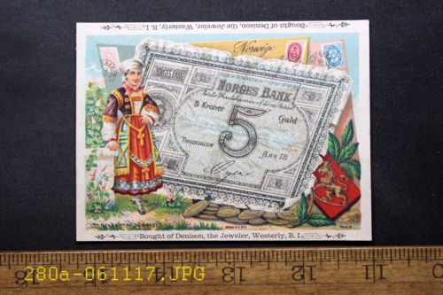 Antique Victorian Trade Card Denison Jeweler Westerly, R.I. Norges Bank Currency