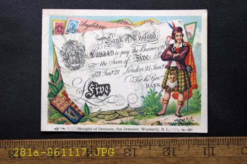 Antique Victorian Trade Card Denison Jeweler Westerly, R.I. Bank of England