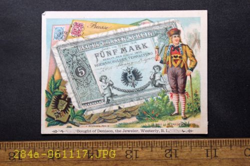 Antique Victorian Trade Card Denison Jeweler Westerly R.I. Funf Mark Currency