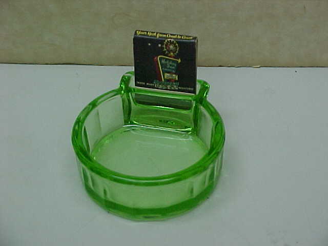Title (ebay affiliate link): VINTAGE GREEN DEPRESSION GLASS ASHTRAY WITH MATCHBOOK HOLDER