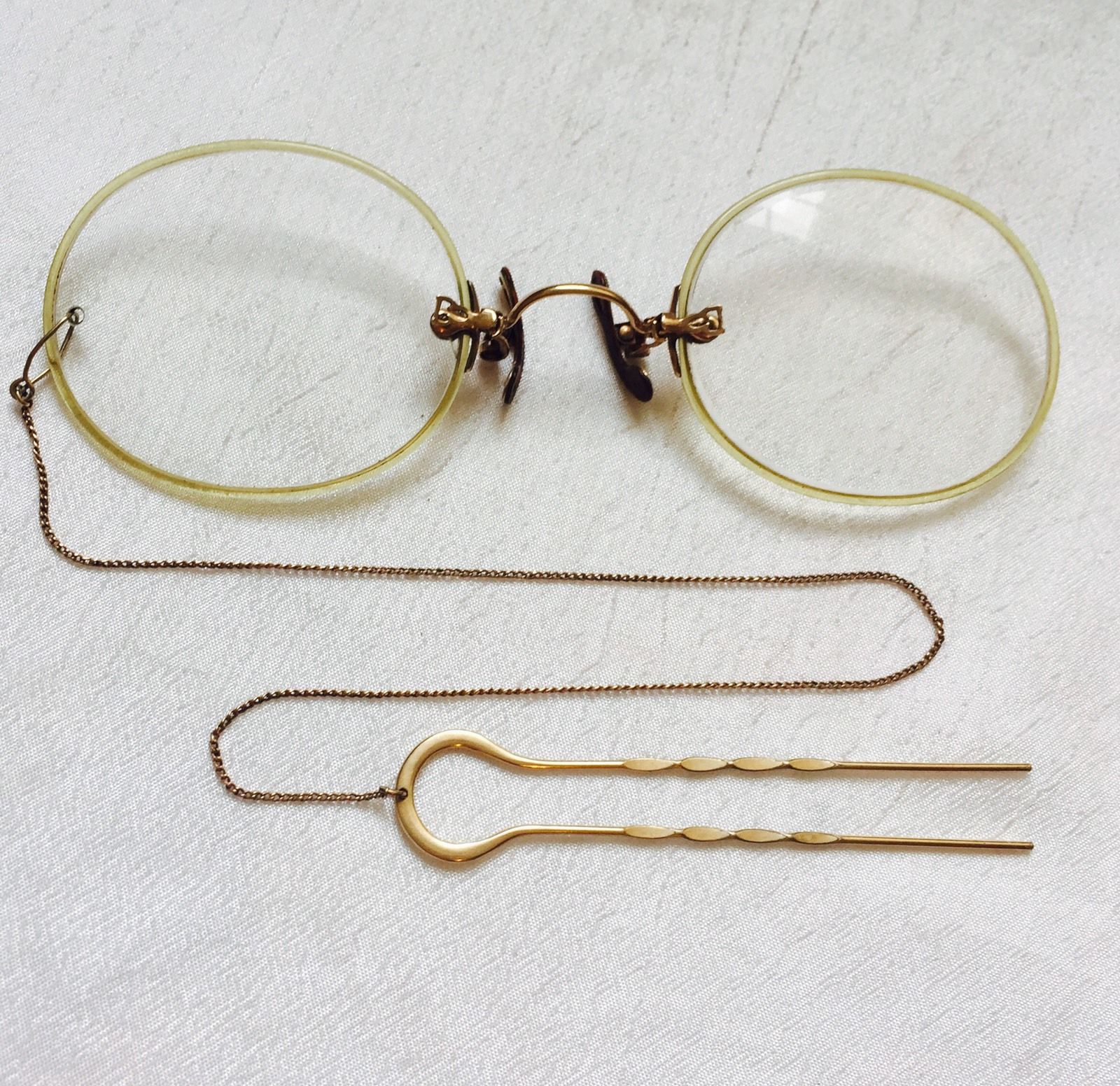 Title (ebay affiliate link): Antique Gold Filled Cellluloid Frame SHURON Pince Nez Spectacles + Hairpin Chain