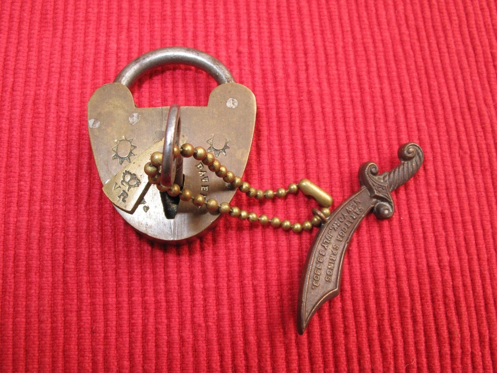 Title (ebay affiliate link): ANTIQUE BRITISH VR CROWN SM BRASS PADLOCK W/ WHITEHEAD HOAG KEY PENDANT NO LOCK