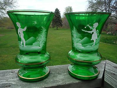 Mary Gregory Pair of Hand Painted Boy & Girl Green Glass 8 1/4" Vases~NO RESERVE
