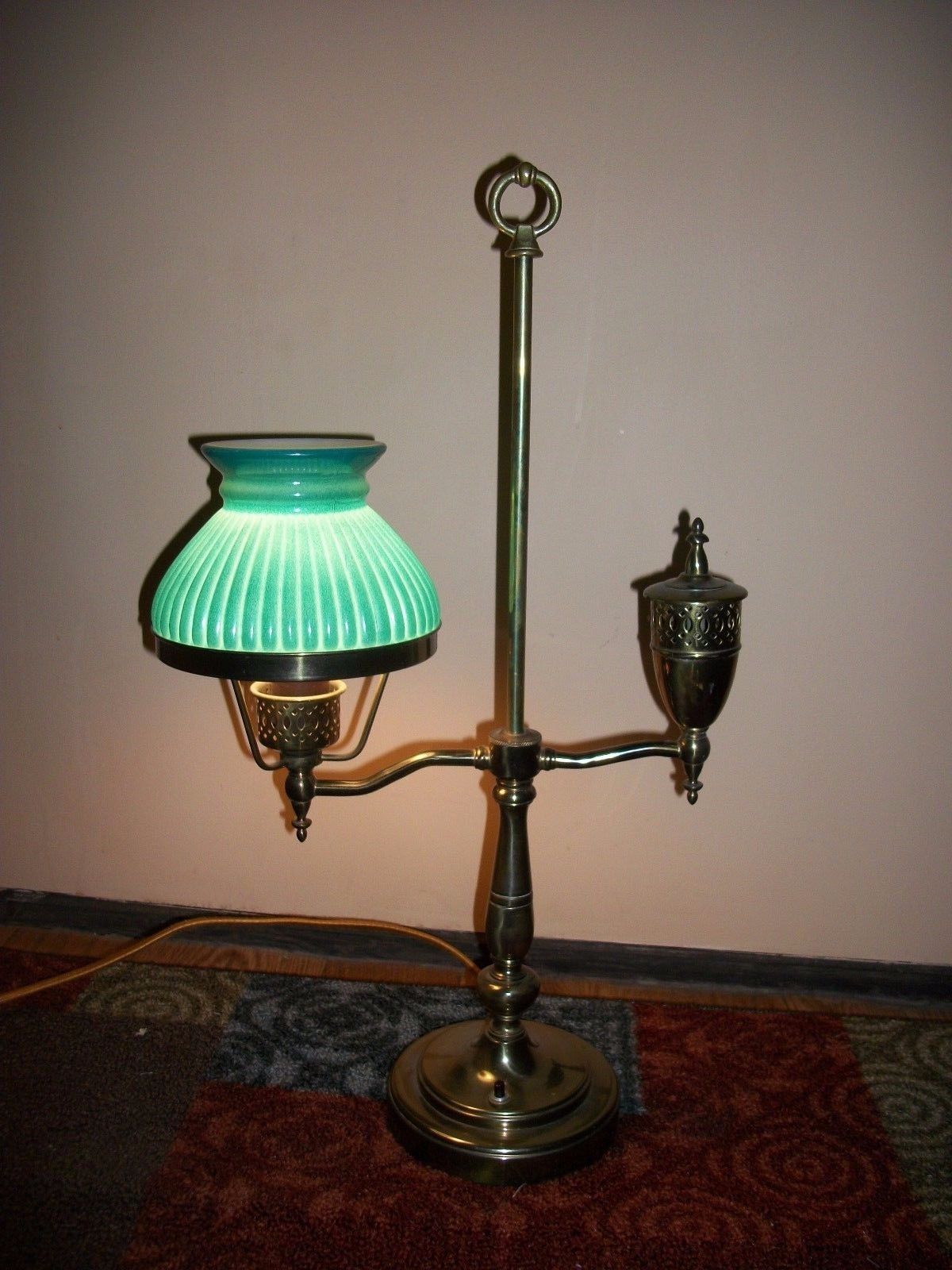 Title (ebay affiliate link): Antique Brass Student Desk Lamp With Green Glass Ribbed Shade Bradley & Hubbard?