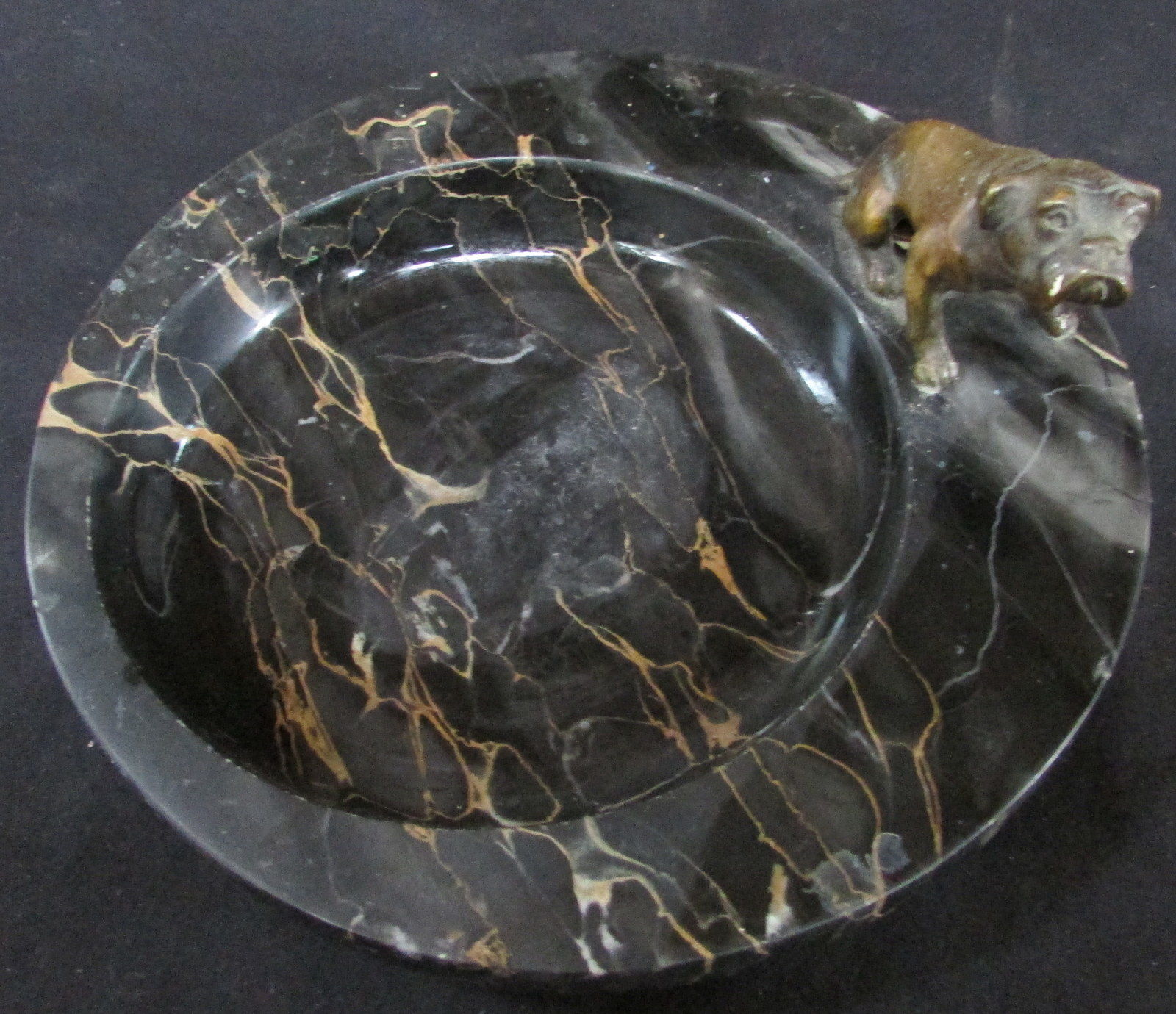 NICE VINTAGE BLACK SWIRL MARBLE ASHTRAY OR BOWL WITH BRONZE BULLDOG FIGURE