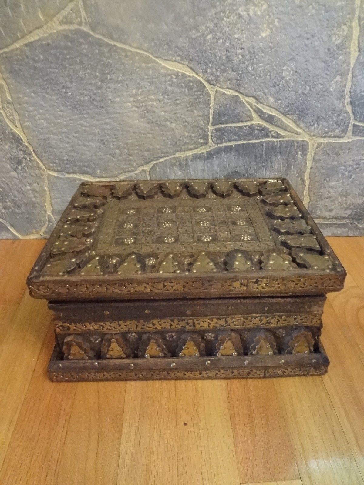 LARGE ANTIQUE VINTAGE ORNATE WOOD BRASS TREASURE BOX