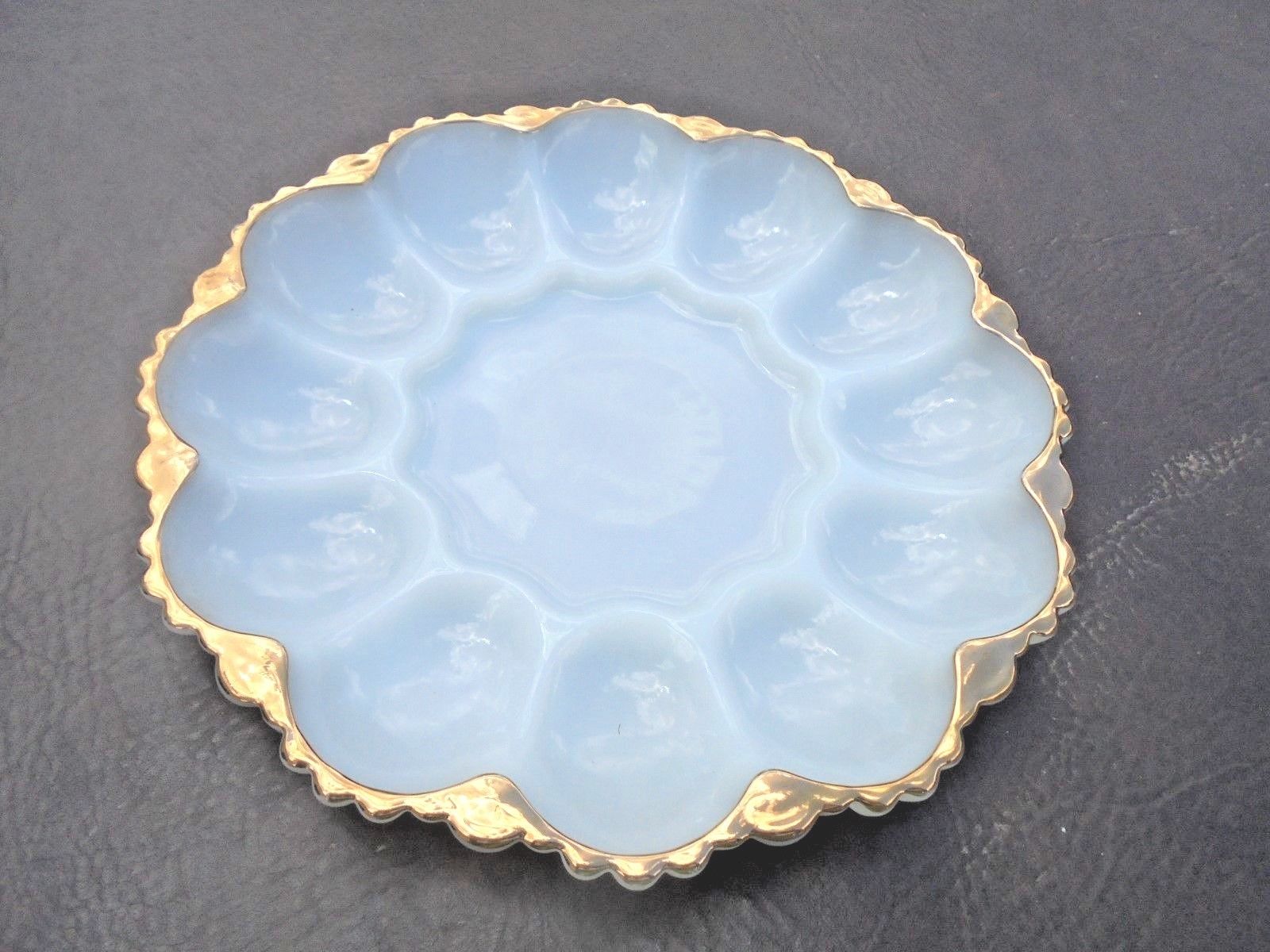 Title (ebay affiliate link): Vintage Milk glass Deviled Egg serving dish plate platter, gold trim 10" EUC