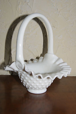 Vintage Fenton White Milk Glass Basket Embossed Mark 1950s Ruffled Edge
